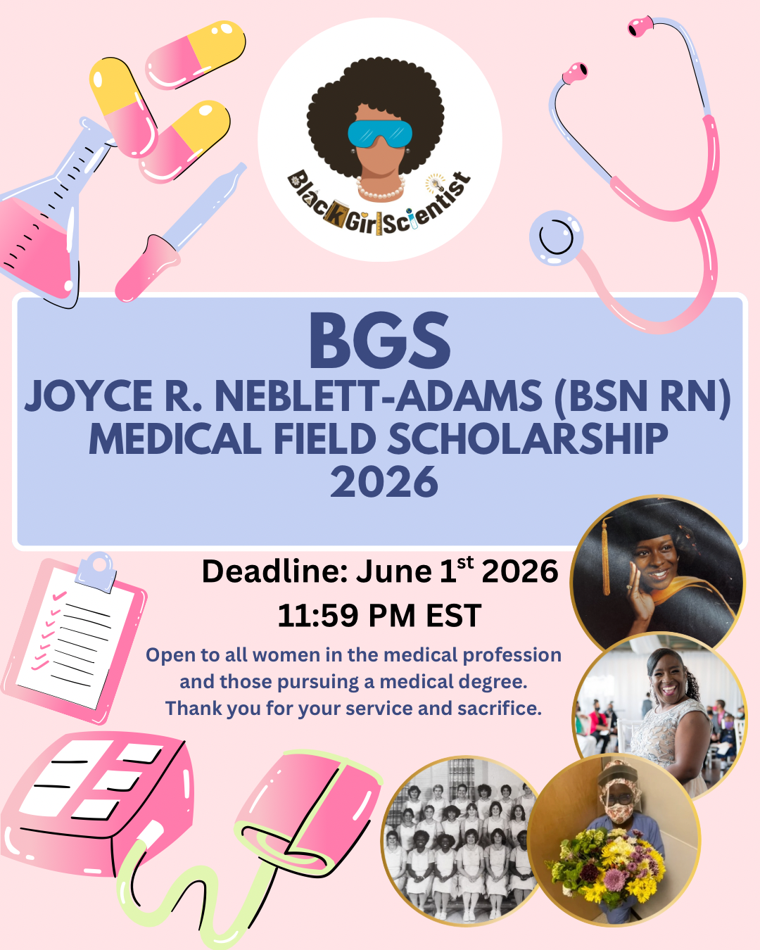 BlackGirlScientist will be awarding TWO $200 scholarships honoring Joyce R. Neblett-Adams (BSN, RN), a first-generation college graduate who earned her nursing degree from the prestigious Medical College of Virginia (MCV), now part of Virginia Commonwealth University (VCU). With 41 years of nursing service, she has dedicated her career to providing compassionate care and excellence in the medical field. This scholarship supports women working in or pursuing careers across the medical and healthcare professions. Deadline: June 1st, 2026 at 11:59 EST. Click below to apply.