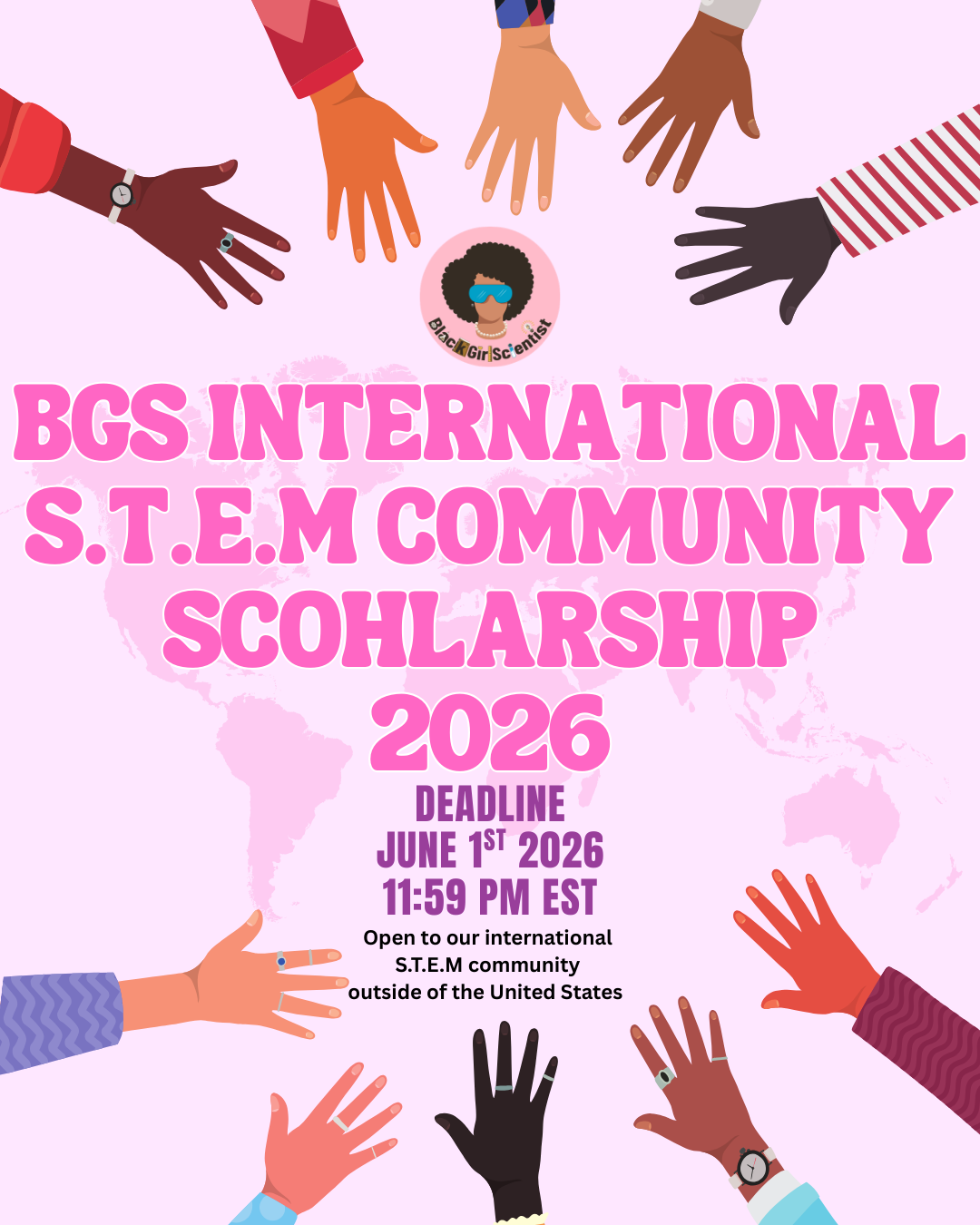 BlackGirlScientist will be awarding TWO $200 scholarships celebrating our global BGS community. This scholarship supports women pursuing Science, Technology, Engineering, and Mathematics (STEM) outside of the United States and recognizes the growing international community that has supported BlackGirlScientist over the past five years. Deadline: June 1st, 2026 at 11:59 EST. Click below to apply.