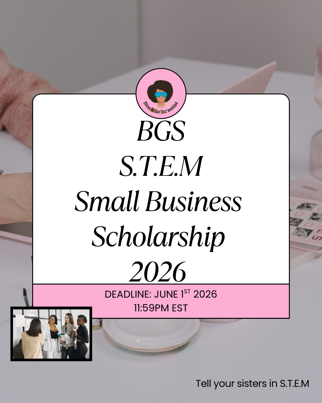 BlackGirlScientist will be awarding TWO $200 scholarships supporting girls and women-owned STEM businesses. This scholarship recognizes entrepreneurs using science, technology, engineering, or mathematics to build innovative businesses and encourages continued growth and leadership in STEM entrepreneurship. Deadline: June 1st, 2026 at 11:59 EST. Click below to apply.